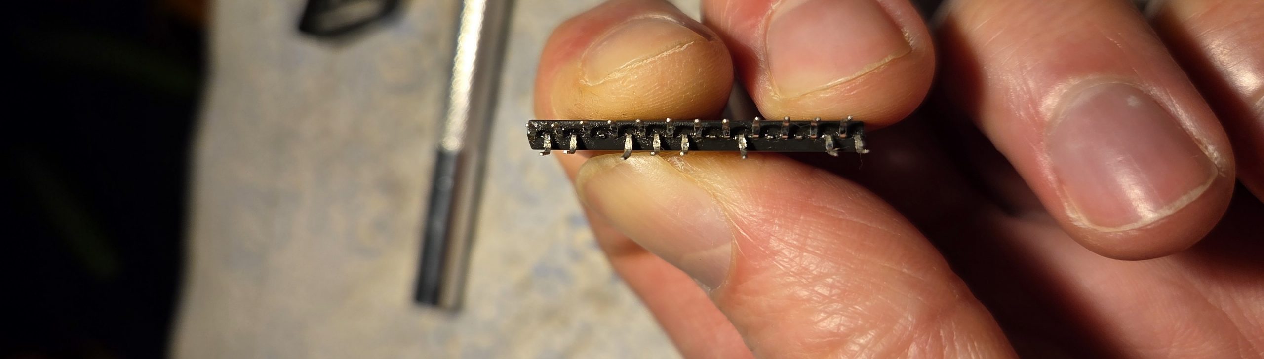 First I removed the soldering paste residue – IPA, contact cleaner, and the iron itself did it. Then, I had to align the pins again, as we started with this situation here: