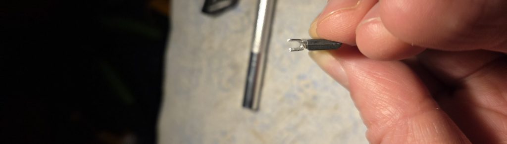 And now on with the soldering. In the process one other leg got lost, making the count to 5. In order to work the piece out at a decent height (steady hand, remember?) I’ve just temporarly taped on top of the tip spool. Some moments later, and…there we have it.